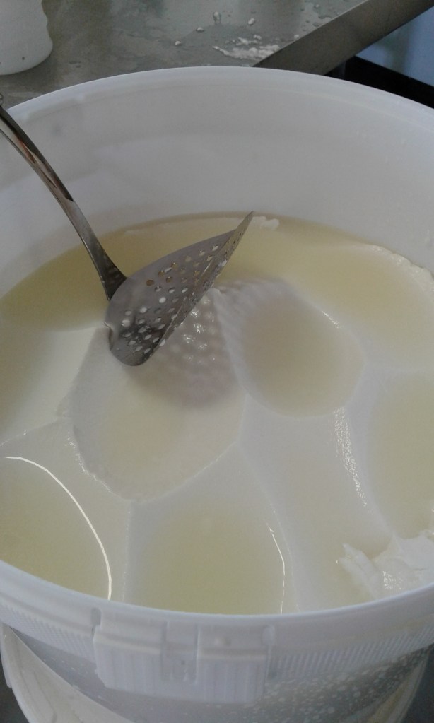 Après la traite nous refroidissons le lait à 20°C, nous y ajoutons des ferments et de la présure. Après 24h le lait est caillé et nous pouvons le mouler, à la main dans des moules individuels (ronds pour mes crottins, carrés pour les cendrés).